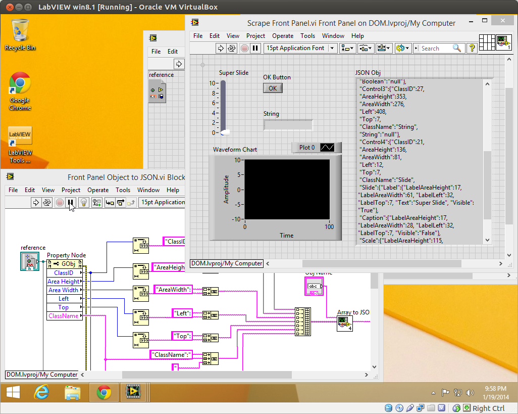 Outside of the web browser the DOM is represented in a format called JSON [Wiki]. The JSON format is text based and conveniently mimics the DOM format, with a similar hierarchy and key/value pairs. JavaScript can convert JSON objects into DOM objects and back again. If we can create a JSON object in LabVIEW that represents the Front Panel Controls, then we can recreate that front panel in a web browser.