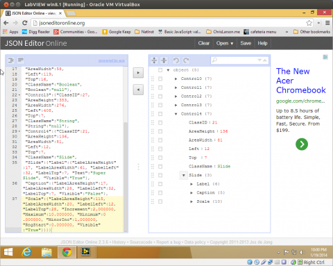}To check the correctness of the JSON format I copied the output JSON and pasted it into an online JSON editor. The online editor arranges the JSON into drop down lists for each front panel object. The next step is to pass this JSON object through a LabVIEW Web Service to a JavaScript program that will translate the JSON into HTML and CSS to recreate the LabVIEW front panel in a web browser running on a PC, iPad, iPhone, tablet, etc.