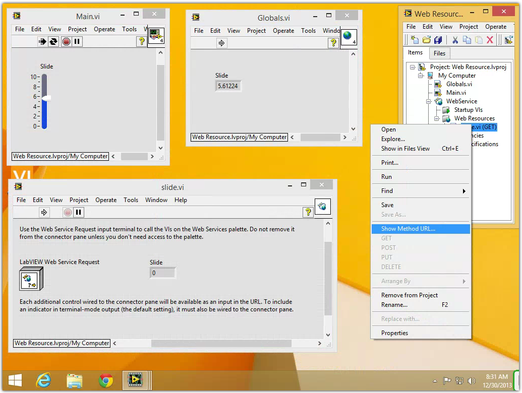 Now start the Web Service. Right click on the Web Resource VI and select Show Method URL. Copy the URL and paste it into a web browser. The web browser should display XML with the name of the front panel indicator and its present value.