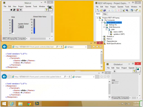 This is a very simple REST API written in LabVIEW Web Services. The other two methods, create and delete, can be added in similar fashion to update. Any program that can make an HTTP GET request can now interact with your LabVIEW programs.